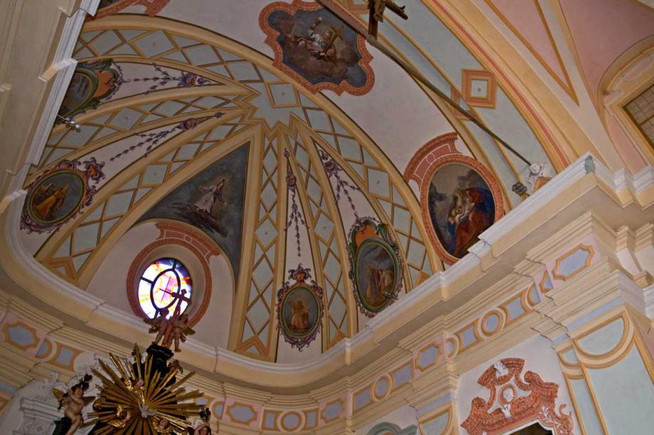 "Von der romanischen, 1207 bezeugten Vorgängerkirche sind der Glockenturm und einige Mauerelemente des Schiffs erhalten, die in den Barockbau aus den Jahren 1733 – 1736 integriert sind. Aus dem 18. Jh. stammen auch der Rokoko-Hochaltar und die Stuckaturen des Innenraums, darunter die elegante Dekoration der Kapelle der Heiligen Katharina.