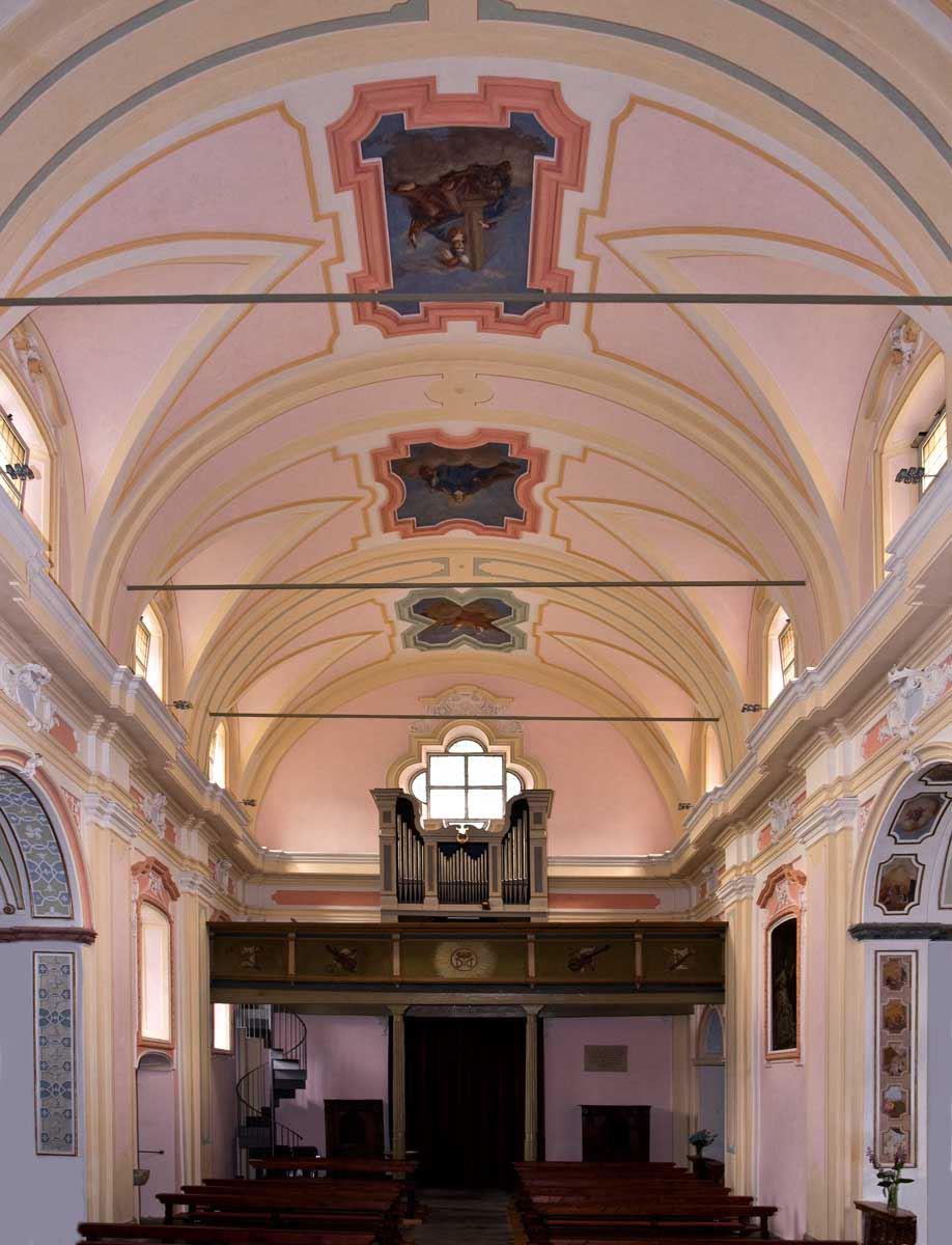 Von dem schon 1207 erwähnten Gebäude ist nur der Glockenturm übrig geblieben, dessen oberer Teil jedoch verändert wurde. Am Haupteingang sind Fragmente von Fresken aus dem Beginn des 16. Jahrhundert zu sehen. Die jetzige Kirche geht auf das Jahr 1733 zurück, wie dem Portal abzulesen ist, ebenso den bleigefassten Fenstern des Kirchenschiffs. Das Innere weist wertvolle Stukkaturen auf, vor allem in der rechten Seitenkapelle, die der heiligen Katharina gewidmet ist, bereichert mit einem Fresko des heiligen Franziskus (1770) und einer holzgeschnitzten Tafel von Francesco Solari mit der Jahrzahl 1732. Der Hauptaltar in vielfarbigem Marmor ist im Rokokostil gehalten. Die Kreuzwegstationen auf dem Kirchplatz sind mit Mosaiken von Aurelio Gonzato versehen. Die Totenkapelle ist in der zweiten Hälfte von den Seregnesi vollständig mit Fresken ausgemalt worden. Restaurierung im Gange."