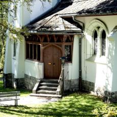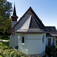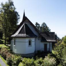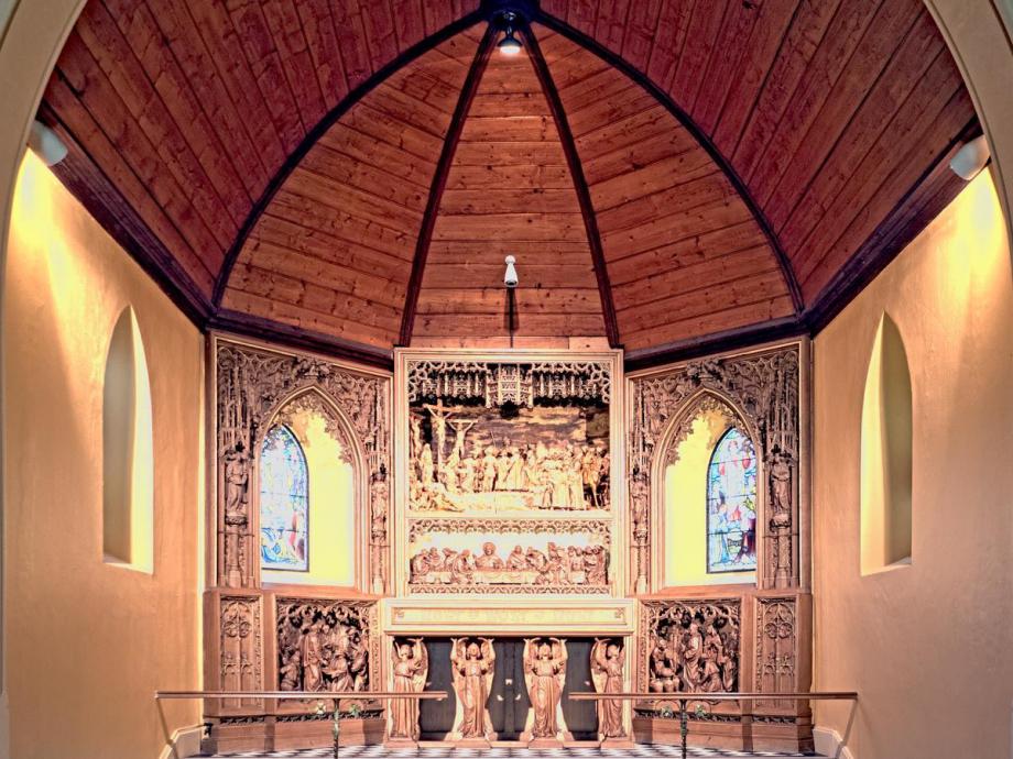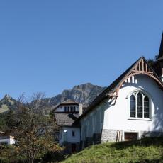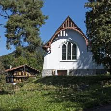 1905 erbaut, wird die Kapelle im Februar 1906 eingeweiht. Sie wird dem „Heiligen Michael und allen Engeln“ geweiht, was sich vor allem bei den Fenstern ausdrückt: auf der einen Seite die Taten der Engel im Alten Testament, auf der anderen des Neuen Testaments. Diese „Ikonen aus Glas“ wurden in London geschaffen. Gemäß Glasmeister Jean Prahin ist ein solches Ensemble sehr selten in der Schweiz. 1992 hat er sie restauriert.