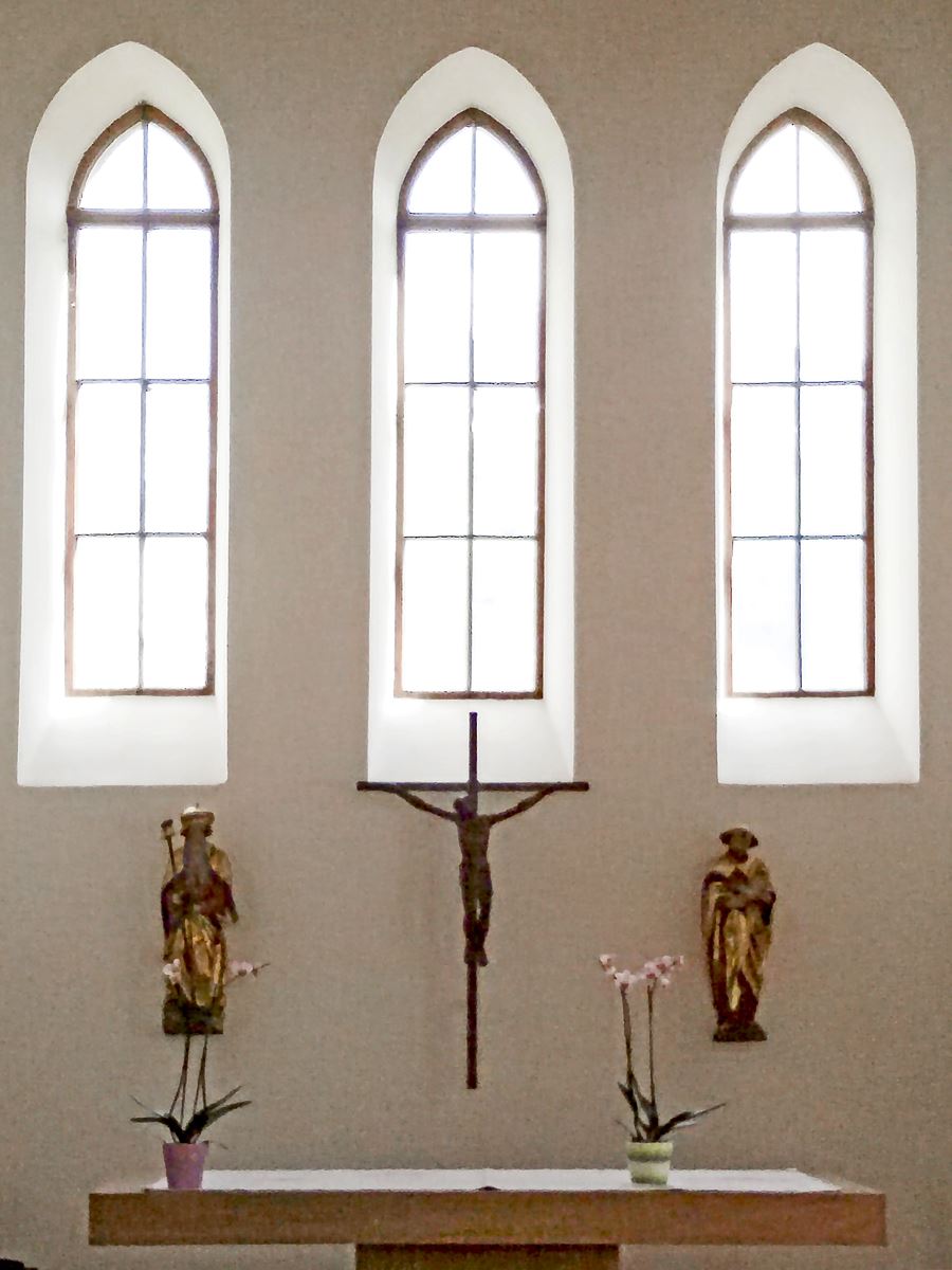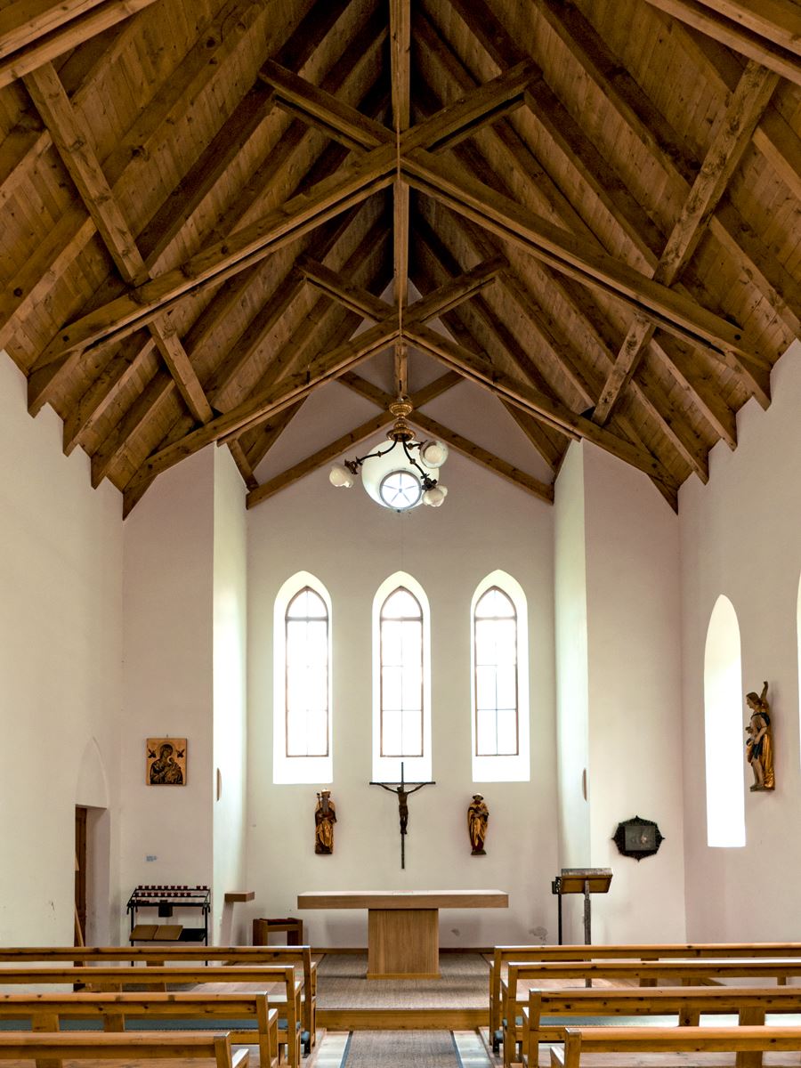 Das bronzene Altarkreuz und geschmiedete Lesepult wurden 1966 von Hans Loretan aus Brig gefertigt. Der geschmiedete Tabernakel aus dem Jahr 1969 stammt vom selben Künstler.