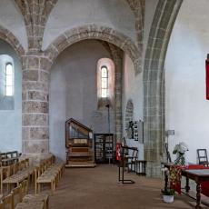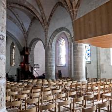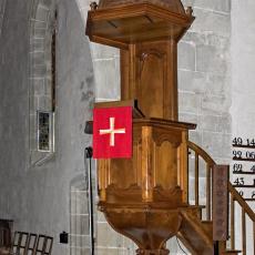 Das weithin sichtbare, altehrwürdige Gotteshaus zieht viele Besucher an. Wie staunen sie erst, wenn sie die Vorhalle durchschritten haben und die paar Stufen hinabgestiegen sind ins Dämmerlicht des weiten Schiffs! Wie strahlen da die modernen Kirchenfenster des Waadtländer Künstlers Jean Prahin! Der hohe Raum ist erfüllt von Frieden und Har- monie. Dabei ist das Baumaterial überhaupt nicht einheitlich: die einen Säulen des Kirchenschiffs sind aus hellem, kaum bearbeitetem Tuff- stein, wogegen einige andere aus grauer, mit feinen Linien verzierter Molasse bestehen. Die Bogenrundungen des Mittelschiffs sind aus Tuff, diejenigen des Chors hingegen aus Molasse.