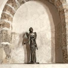 In einem schmalen Fenster über der Orgeltreppe hat Jean Prahin den heiligen Vincent dargestellt und daneben, auf der Bergseite, die vier Elemente : Erde, Wasser, Luft und Feuer, gemäß der antiken Lehre von den Grundstoffen. Diesen Fenstern entsprechen auf der Seeseite jene mit den stark stilisierten Symbolen der vier Evangelisten: der Stier des Lukas, der Löwe des Markus, der Adler des Johannes und der beflügelte Mensch des Matthäus, in feinfühligem Zusammenspiel der jeweiligen Farben. [Das Bild des Evang. Lukas fehlt unten, da die neue Orgelempore es verdeckt].