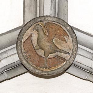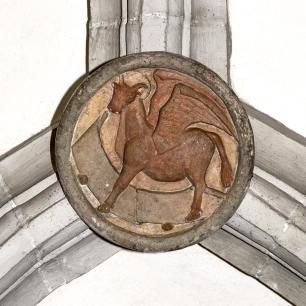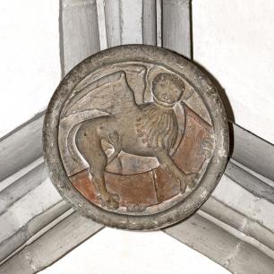 Innen (4) · südl. Seitenschiff vorn: Schlußsteine · Christus und die vier Evangelisten(symbole)