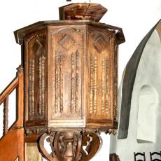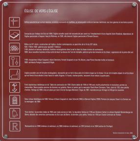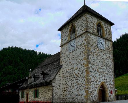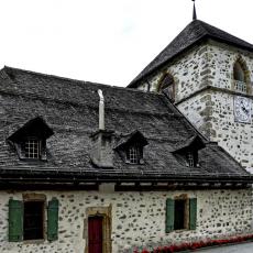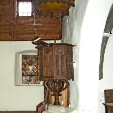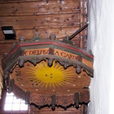 Edifice caractérisé par sa tour massive, sa toiture recouverte de tavillons, sa remarquable voûte en berceau lambrissé, ses trois galeries et ses bancs-poutres