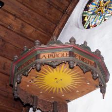 Deux vitraux héraldiques de 1580. Vitraux d'Alexis Guignard et Jean Schmidt (1945) et Bernard Viglino (1959). Peinture de Jacques Clavel «Le Sermon sur la montagne» de 1954.