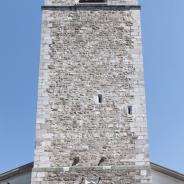 Der Glockenturm, ein Werk des Baumeisters Jean Dunoyer aus Vouvry wurde im Jahre 1497 begonnen, aber erst 1521 fertiggestellt. Er stand ursprünglich vor dem Schiff aus gotischer Zeit, zu dem auch der heutige Chor gehört. Über dem Portal ist mit 1498 das Datum der ersten Bauetappe sowie das Kreuz des heiligen Mauritius und das Monogramm IHS angebracht (Iesus Hominum Salvator: Jesus, der Retter der Menschen). Die vier Ecktürmchen geben dem Glockenturm einen burgartigen Charakter, doch hatten sie immer nur schmückende Funktion. Ursprünglich schloss ein Spitzhelm den Glockenturm ab, der jedoch 1563 durch einen heftigen Sturm weggerissen wurde. Die vier Glocken stammen aus den Jahren 1602 (neugegossen 1887), 1603 und 1887.