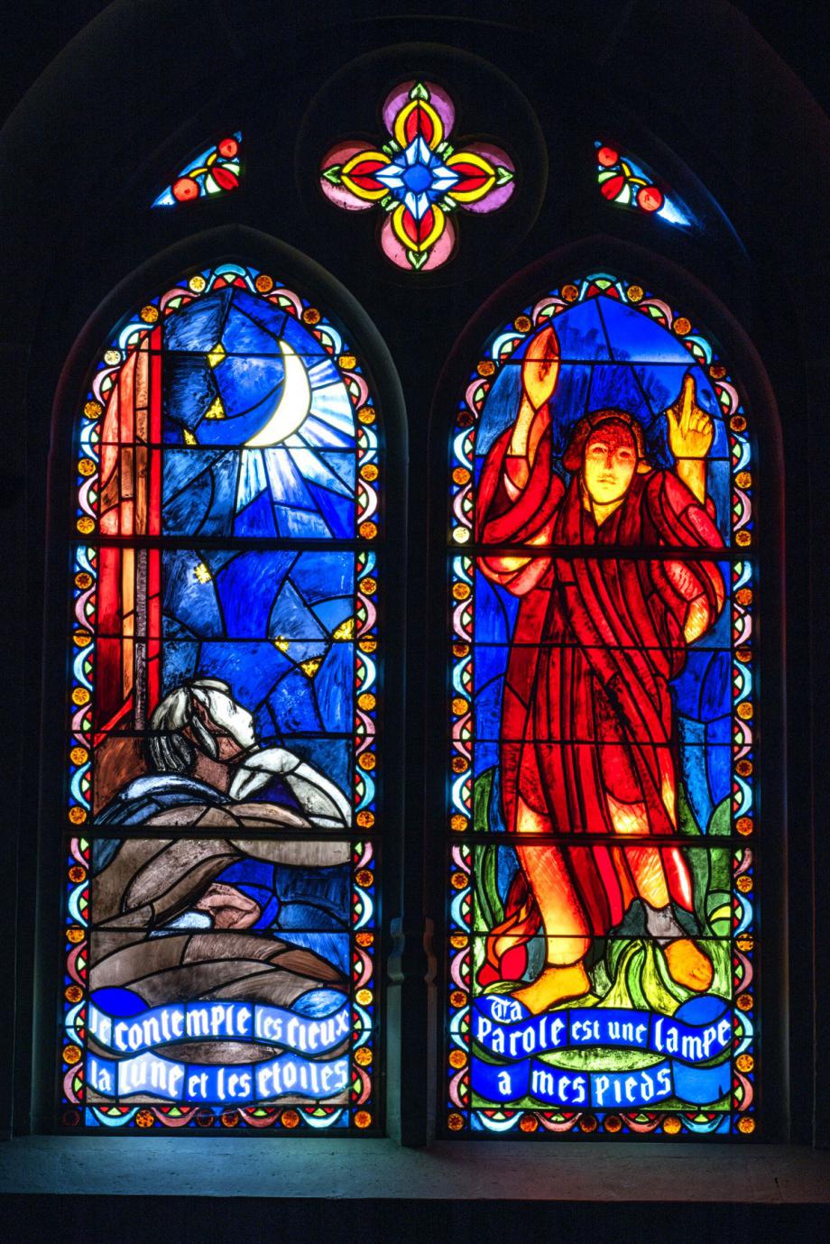 Ernest Biéler entwarf zwischen 1945 und 1950 die Fenster der Seitenschiffe. Diejenigen der westlichen Kapellen zeigen das Leben Christi, während die südlichen Fenster Themen des Alten Testamentes und die nördlichen des Neuen Testamentes aufgreifen. Informationen zum Künstler auch auf Wikipedia (französisch) und im Dictionnaire Historique de Suisse,