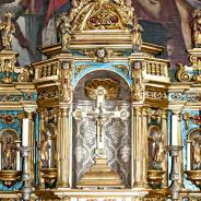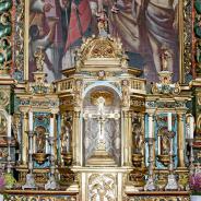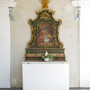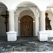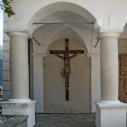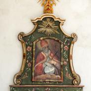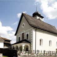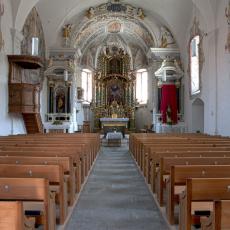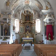Die nach Süden gerichtete Barockkirche wurde Mitte des 17. Jahrhunderts an der Stelle von zwei Vorgängerbauten errichtet, von denen nur die originale Eingangstüre mit den Schnitzereien übernommen wurde. In der Vorhalle befindet sich ein bemerkenswertes aber auch schockierendes Beispiel eines gemarterten Christus am Kreuz.