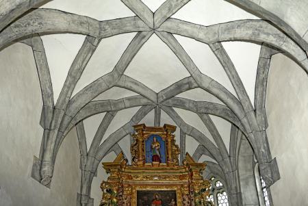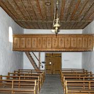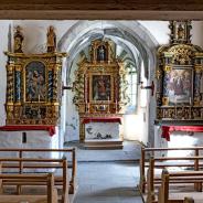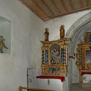 Dem mit einer flachen nachgotischen Leistendecke gedeckten Schiff schliesst sich im Nordosten ein dreiseitig geschlossener Chor an, der mit einem Sterngewölbe gedeckt ist. In den Chor sind spätgotische Masswerkfenster eingelassen, in der rechten Seitenwand des Schiffs sind es romanische Rundbogenfenster. Das Christophorusbild oberhalb des Schrägdaches an der Front wurde anlässlich einer Renovation übermalt. Von den drei Holzaltären ist der rechte Seitenaltar der älteste; er stammt aus dem Jahr 1666. Der linke Seitenaltar stammt aus der Zeit um 1730, der Hochaltar entstand Anfang des 18. Jahrhunderts. Die Glocke stammt von Gaudentz Hempel, wurde 1683 gegossen und hat einen Durchmesser von 43 Zentimetern[1]. Pietà Die Figurengruppe der Pietà ist aus Lindenholz geschnitzt, 110 Zentimeter hoch und 50 Zentimeter breit. Erwin Poeschel datiert sie in die Zeit um 1360. Bis zur Zeit der Reformation, bis gegen 1530, stand die Figur vermutlich in der Kirche von Duvin. Wie sie nach Peiden kam, ist unklar. (s.u.)