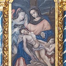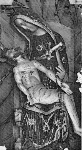 "In einer Nische der Nordwand ein hochgotisches Vesperbild aus Holz, H. 110 cm, hinten ausgehöhlt und mit Deckbrett verschlossen. Zwei der Finger Christi fehlen. Der Umriss umfliesst die Figur wie eine sich neigende Welle; um 1360—1370. Neu bemalt, Sternchen und Schwerter spätere Zutaten. Das Bildwerk stand vor der Reformation vermutlich in Duvin(Dies wohl der wahre Kern der Überlieferung, dass die von den Duvinern in das Tobel geworfene Figur von den Peidnern bei der Einmündung des Baches in den Glenner herausgefischt worden sei.)"