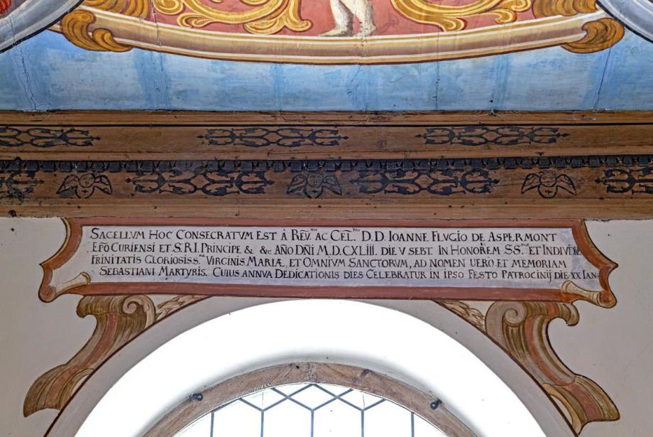 SACELLUM HOC CONSECRATUM EST A REV AC. CEL. D. D. JOANNE FLUGIO DE ASPERMONT ERO CURIENSI ET S.R.I. PRINCIPE ANNO DNI. MDCXLIII DIE V SEPT. [05.09.1643] IN HONOREM SS. ET INDIVIDA TRINITATIS GLORIOSIS VIRGINIS MARIA ET OMNIUM SANCTORUM, AD NOMEN VERO ET MEMORIAM SEBASTIANI MARTYRIS. CUIUS ANNUA DIES CELEBRATUR IN IPSO FESTO PATROCINIJ DIE XX IAN