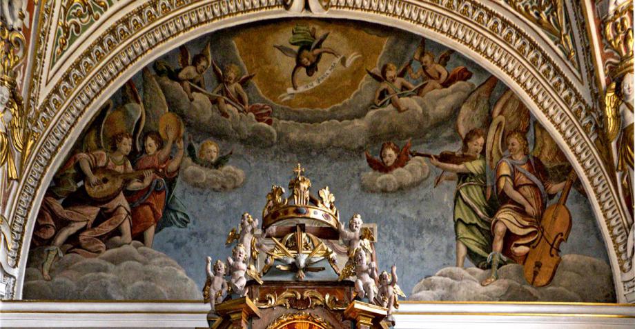 Im Schild über dem Hochaltar: Auferstehung der Gottesmutter aus dem Grab (Alessandro Gorla 1628). Oben in der Mitte trägt ein kleiner Engel ein Spruchband "VENI, SPOSA MEA" (Komm, meine Braut).
