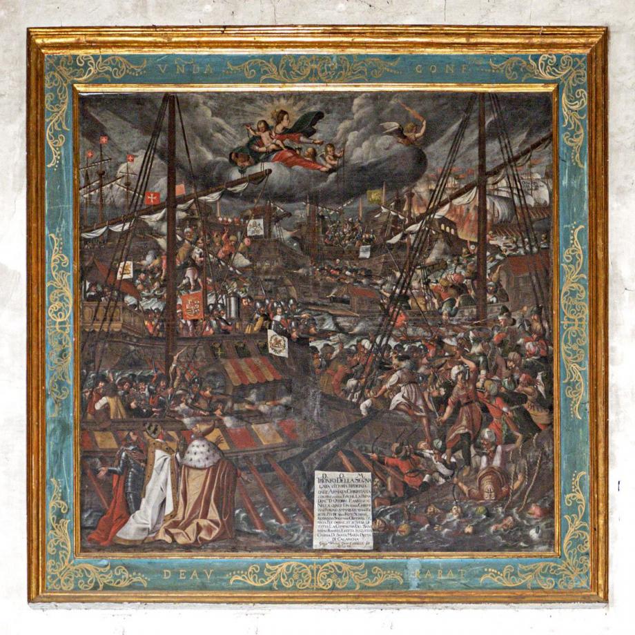 Die ganze Inschrift lautet: "D·O·M Trionfo della segna lata vittoria riportata dall'armata christiana contro 120.000 turchi, la prima dom.ca d'otobre l'anno 1571. Nella quale da 20.000 christiani furono ammazzati 32.000 turchi: piu de 3000 fatti schiavi, restando solo 7000 christiani. Depinta per ordine et a spesa di tutta la compagnia del santissimo Rosario, eretta in questa chiesa di Santa Maria detta di Chalanca Georgius Wilhelmus Graesner Constantiensis fecit 1649."