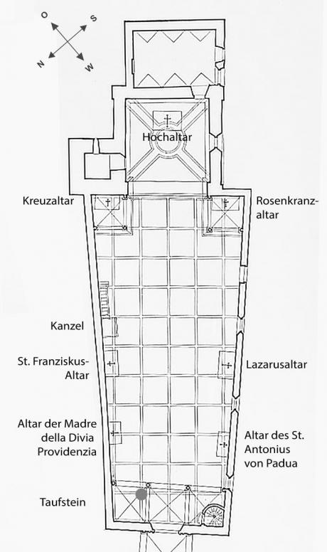 Dadurch, dass das Schiff (27 Meter Länge, 9 Meter vordere Breite) bei der Eingangsseite 3 Meter schmaler ist als beim Chor, ergibt sich ein perspektivischer Effekt. Es ist mit einer flachen hölzernen Kassetten-decke gedeckt; der quadratische Chor trägt ein Kreuzgratgewölbe. Vermauerte Spitzbogenfenster an der Nordseite belegen sein gotisches Mauerwerk. Der gotische Turm mit Blendnischen und Spitzbogenfriesen steht an der Nordseite. Die toskanische Vorhalle stammt aus der 2. Hälfte des 17. Jahrhunderts; das rundbogige Steinportal wurde 1606 von Giovanni Andrioli geschaffen.