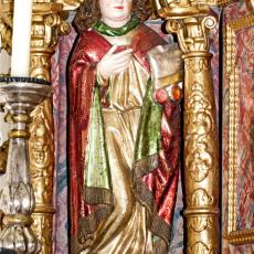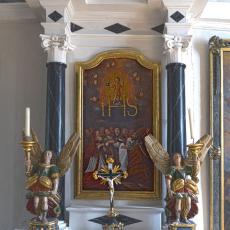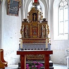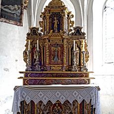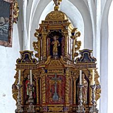 Der zierliche Hochaltar aus dem 17. Jahrhundert bietet Platz für drei Figuren: Links der Verkündigungsengel Gabriel, rechts Maria und in der Mitte darüber der Kirchenpatron Laurentius. Kaum erkennbar als Bekrönung in der Höhe der Auferstandene mit einer Fahne.