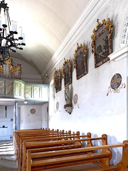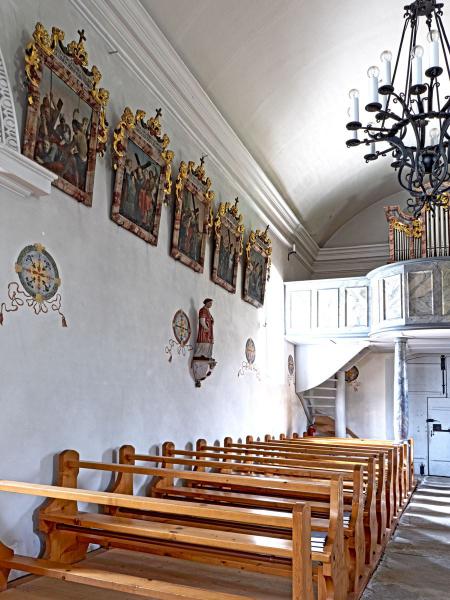 Ein besonderer Schmuck sind die 14 Stationen des Kreuzwegs, die in aufwendig geschnitzten Rocaillerahmen an beiden Schiffswänden zu sehen sind. Erstaunlicherweise wurden die Bilder in deutscher Sprache erläutert..