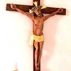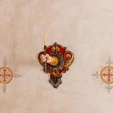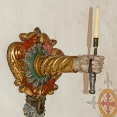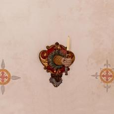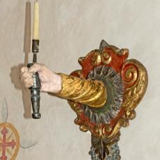 Kerzenleuchter an der Südwand, Westwand: Bild des Hl. Nikolaus von Myra · Madonna · Kruzifix