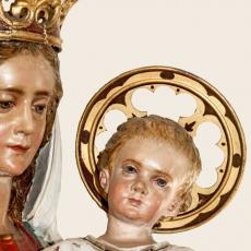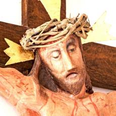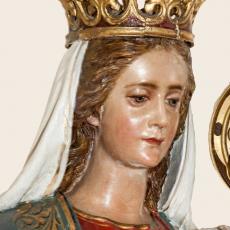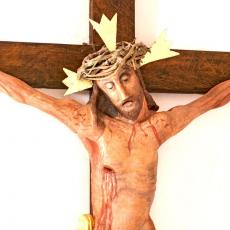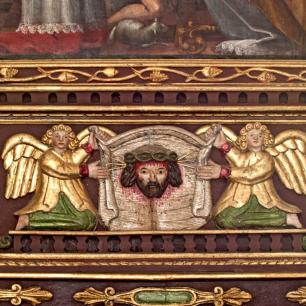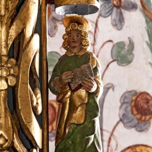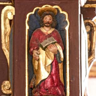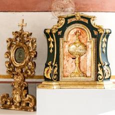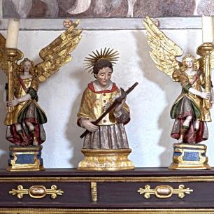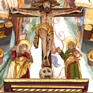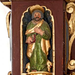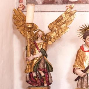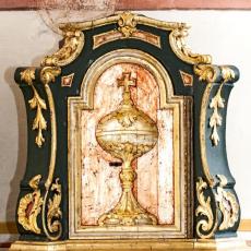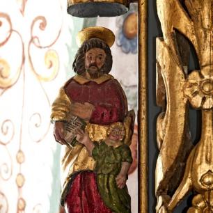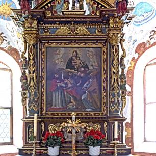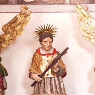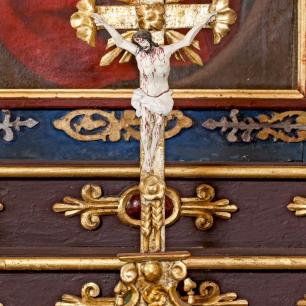 Der Hochaltar ist ein einfacher Renaissance-Aufbau mit zwei Säulen, deren Kern im oberen Teil ausgehölt ist.