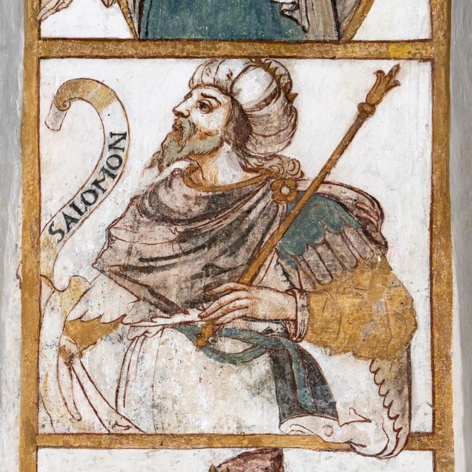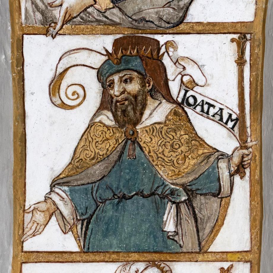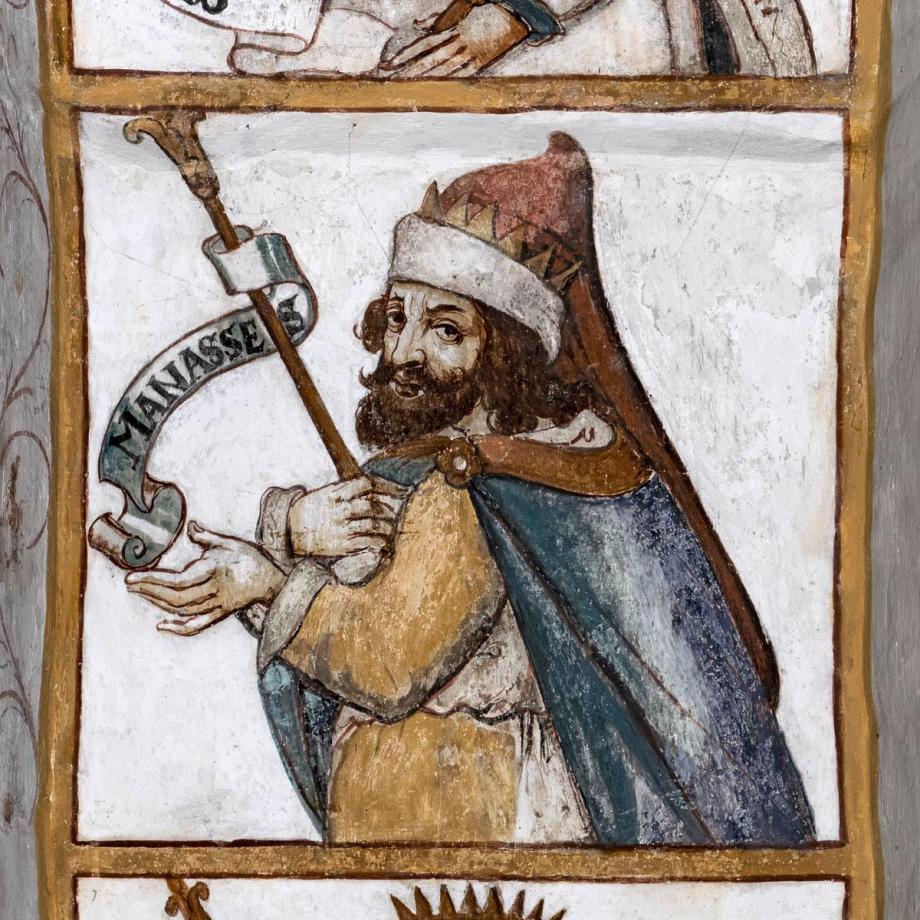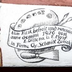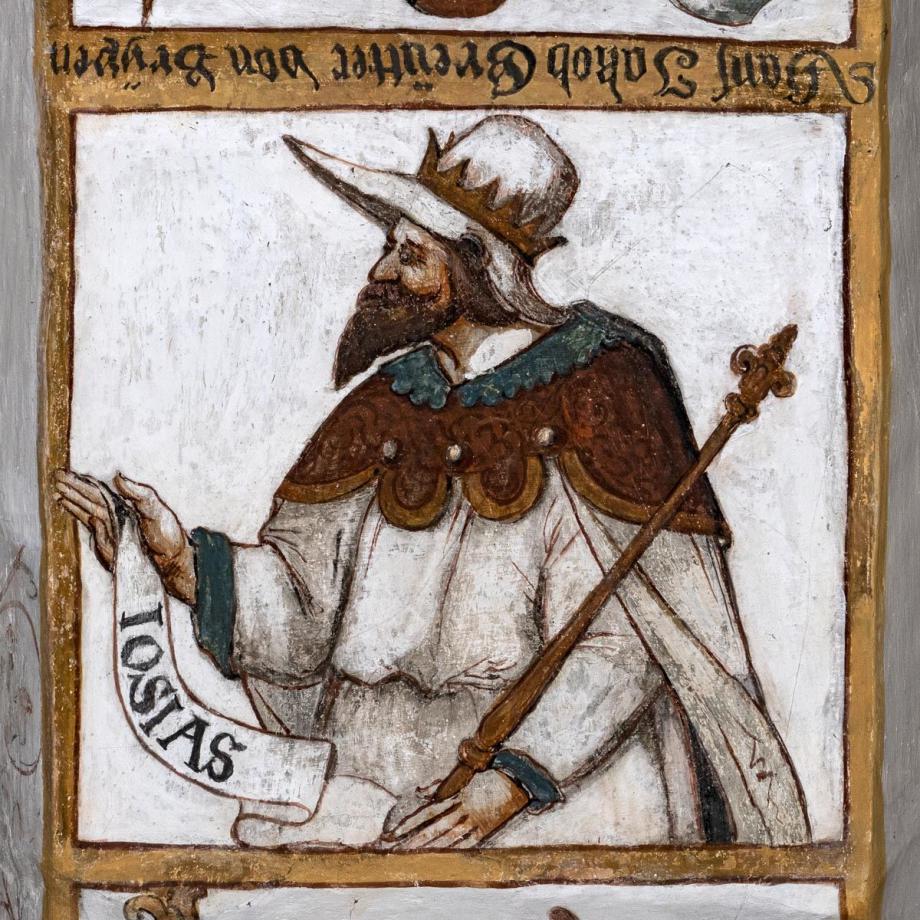 In der Leibung des Chorbogens zwölf Halbfiguren von Vorfahren Christi (nach Matth. I, V. 6—11), deren Namen auf Schriftbändern stehen [Namen] Im Scheitel des Bogens steht die Signatur des Malers: „M(aller) Hans Jakob Greutter von Bryren“. Die Reihenfolge ist z. T. willkürlich: beginnen sollte die Folge mit Jesse, David, Salomon; ferner ist Joatam (Jotham) zwischen Usia und Ahas einzustellen.