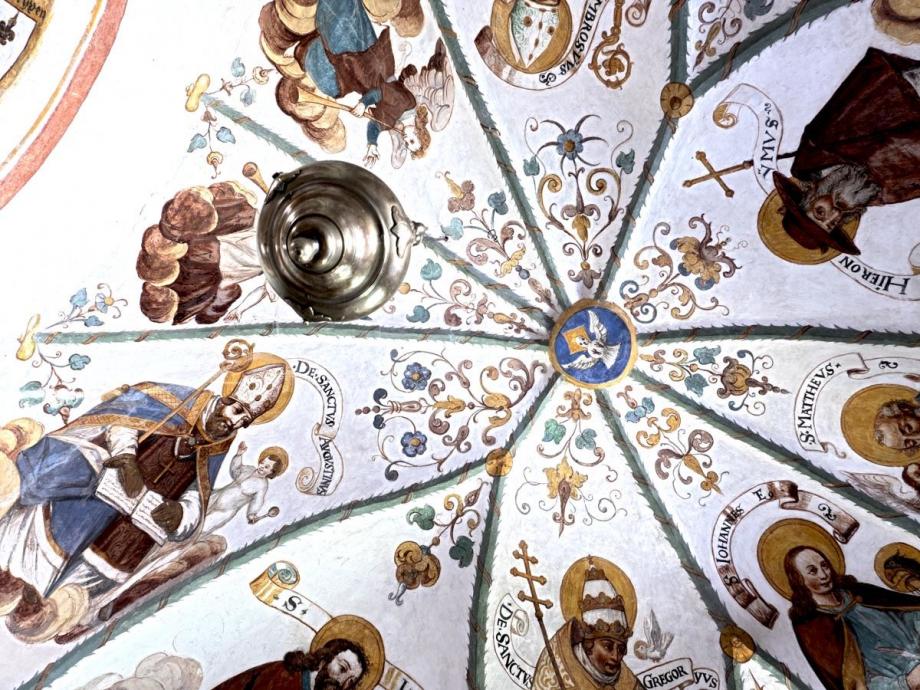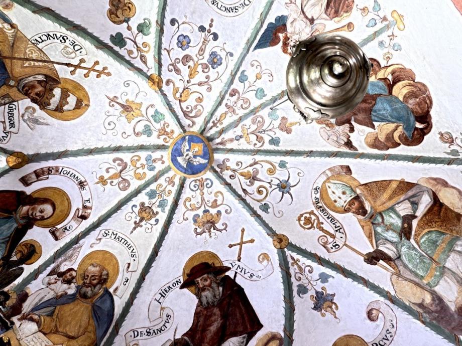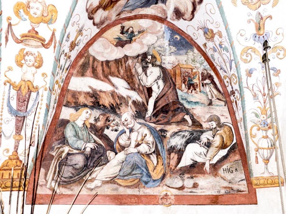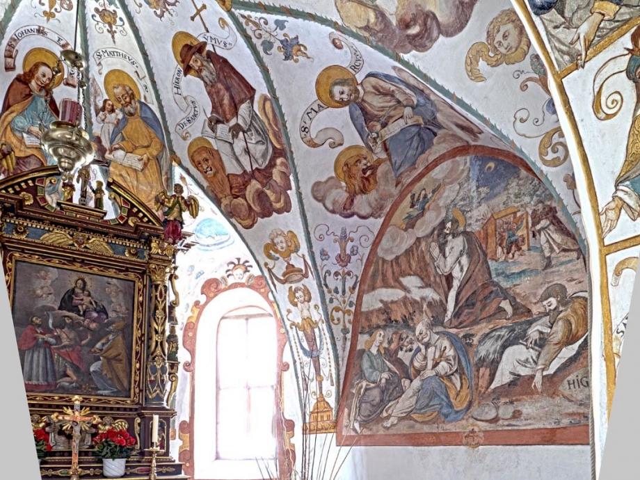 In den Schilden der Längswände westlich das Abendmahl, östlich Gethsemane, signiert „HIGM"(Hans Jakob Greutter Maler). An der Abschlusswand das Datum 1616. Die architektonischen Linien des Gewölbes sind von Laubgewinden betont, und aus den Zwickeln wachsen in gotisierender Art Blumen- und Blattranken. In den Feldern die Gestalten der Evangelisten und der vier abendländischen Kirchenväter, auf Wolkenballen sitzend, sowie zwei posaunen blasende Engel. Die Namen stehen auf geschwungenen Schriftbändern. (Poeschel)