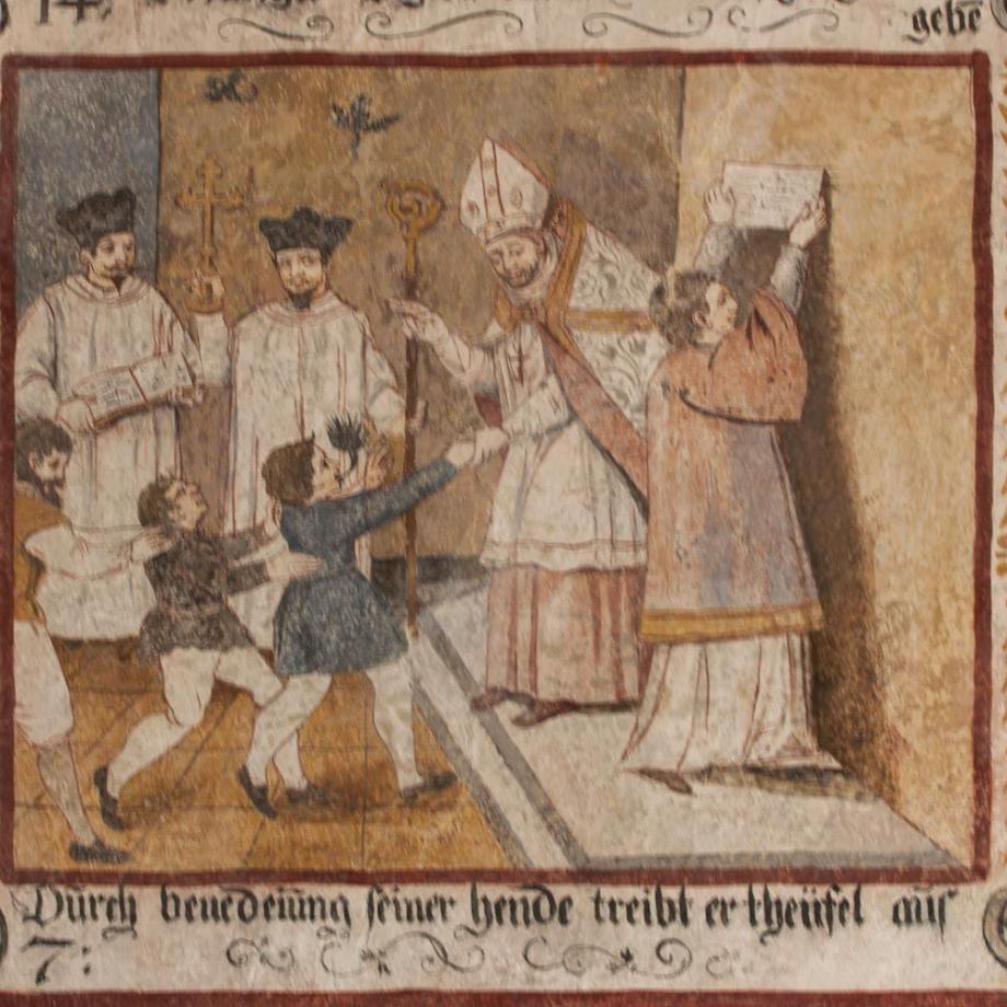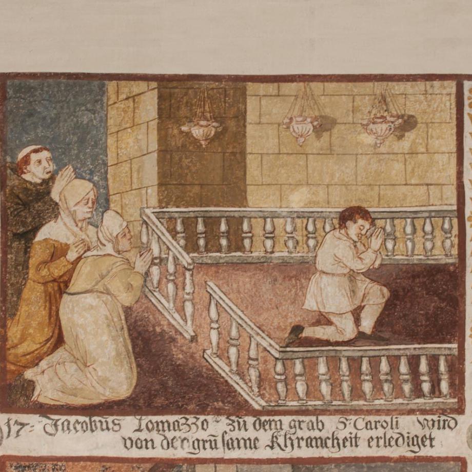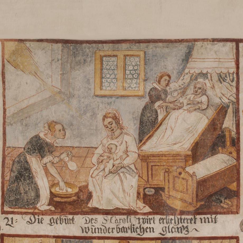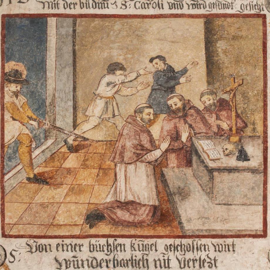 An der Nordwand des Schiffes von etwas späterer Hand ein Zyklus zur Verherrlichung des S. Carlo Borromeo, in drei Reihen von je sieben annähernd quadratischen Feldern, durch erklärende Unterschriften erläutert. Die Reihenfolge ist numeriert und beginnt rechts unten mit einem Bildnis des Heiligen. Dann folgen zehn Darstellungen aus dem Leben des S. Carlo, seine Wahl zum Kardinal und Erzbischof von Mailand, die Teilnahme am Tridentiner Konzil, Errettung vor dem Anschlag der Humiliaten, bischöfliche und seelsorgerische Tätigkeit des Heiligen sowie die Entsendung von geistlichen Visitatoren und Kapuzinermissionen, Exorzismen, Besuche bei Pestkranken und Kinderlehre; hierauf schildern zehn Bildchen Wunderwirkungen durch die Fürbitte des S. Carlo nach dessen Tod, und als letztes — auf den Anfang zurückgreifend — die von wunderbarem Glanz umstrahlte Geburt des Heiligen. Es sind Schildereien im Stil einer Bilderbibel, qualitativ unter dem Niveau von Greutters Malereien im Chor, jedoch ikonographisch und hagiographisch bemerkenswert. Mitte des 17. Jahrhunderts. (Poeschel)