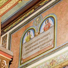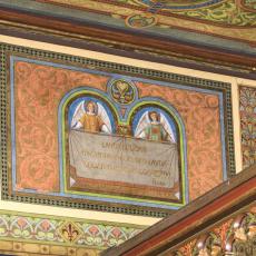 An der Hochwand des Mittelschiffes — vom Altar zur Orgelempore geblickt links — sieht man in den Rundbögen eines Doppelfensters je einen Engel einen Wandteppich halten, darauf steht in goldenen Lettern geschrieben