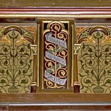 Das Wappen eines jeden Papstes ist auf den Konsolen der reichgeschnitzten Streben; darunter hält ein sitzender Engel ein Schriftband mit den Jahreszahlen der Regierung des jeweiligen Papstes. In gleicher Flucht zieht sich ein Ornamentfries hin; unter diesem fügen sich stilisierte Darstellungen ein von: Adler, Leu, Lilie, Kreuz.