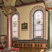 In den Glasgemälden der Stirnwand erkennen wir durch das jeweilige Schriftband die vier Evangelisten. Sie ordnen sich von links nach rechts ein, zeigen einen schematischen Aufbau und sind weiters erkenntlich durch ihr Attribut. Jeder hält einen Gänsekiel in der Rechten, in der Linken umfaßt er ein Buch.