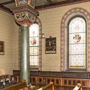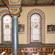 Eine heute wieder mehr beachtenswerte und geschichtlich nicht unbedeutsame Zier unserer Studentenkapelle bilden die Glasmalereien. Wir verdanken sie der Firma Geyling in Wien. Die Art der Darstellung erinnert an die „Nazarener", das ist jene Gruppe von Malern in der ersten Hälfte des 19. Jahrhunderts, die zurückgriffen auf die religiöse Malerei des späten Mittelalters. Ihre Losung hieß: Wahrheit, Schlichtheit, Innigkeit. Dem andächtigen Beschauer unserer Glasgemälde will sich das Leben Jesu in seinen wichtigsten Phasen darbieten. Die Medaillons sind umrankt von stilisierten Blumenmustern in Kreisen, Halbkreisen und Rauten. Beide Fensterseiten entsprechen sich mit den Mustern gegenseitig.