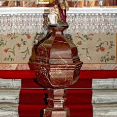 Der Taufstein aus rotem Marmor mit sechseckigem Becken stammt aus der 1. Hälfte des 17. Jh. Die Taufszene im Nazarenerstil wurde 1889 vom Bildhauer Veit aus Oberammergau geschaffen.