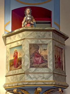 Es handelt sich um eine Figur des Heiligen Vitus, die der Gemeinde vor einiger Zeit von einem Namensträger (Vitus Sulger) geschenkt worden war. Wo aber dahin damit? Die Kanzel wird schon lange nicht mehr zum Predigen genutzt, sinnbildlich könnte man also sagen, Vitus predige selber oder aber auch, dass er die Kirche gut im Blick habe. Die Figur wird also noch länger dort verweilen