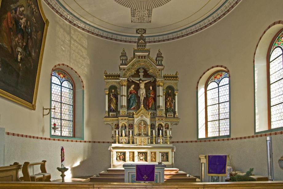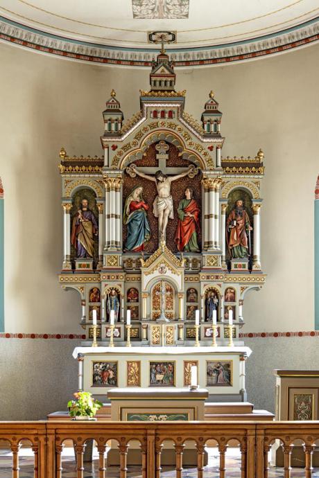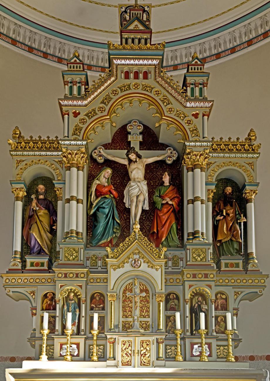 Es ist schon ein etwas seltsames Stück, dieser große, jetzt wieder so bunte Bau. Es läßt sich nicht leugnen, daß »unter der kunstsinnigen Leitung des Pfarrers Detzel von St. Christina, Vorsteher des Kunst-vereins« im Jahr 1897 auf den alten, recht feinen Altar mit den zart gemalten Bildern von F. Bentele ein wuchtiger Oberbau aufgesetzt wurde, der mit seinen Türmen, Säulen und Säulchen den Unterbau fast erdrückt. Wie winzig der Tabernakelengel zu Füßen der Kreuzigungs-gruppe!