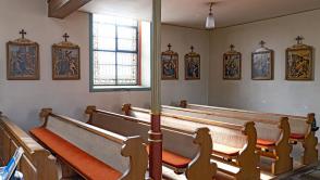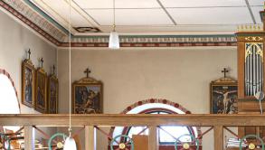 In der Zwischenzeit wurden auch die 5 fehlenden Stationen restauriert und komplettieren nun den Kreuzweg. Allerdings mussten aus Platzgründen die Stationen 8 - 12 auf der Orgelempore angebracht werden und sind damit "aus dem Blick / aus dem Sinn". Nachfolgend drei Fotos mit den Stationen 1 - 7 (Schiff Süd- und Westwand), 8 - 12 (Empore Süd- und Westwand), 13 + 14 (Schiff Nordwand)