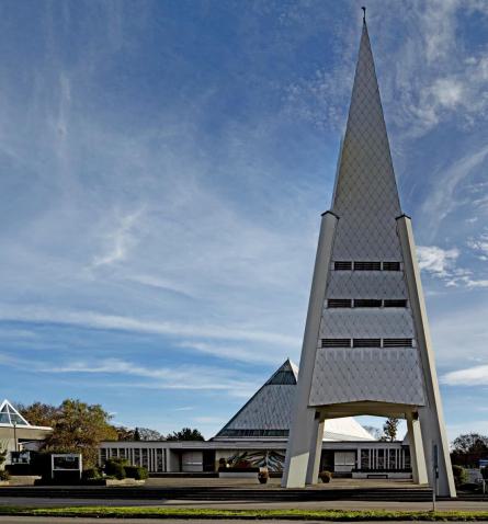 Später baten wir Diether Domes (*1939), den sensiblen, farb-ästhetisch und transzendent Malenden, die wenig gegliederte und graue Hauptfassade der Kirche zu gestalten mit einem großflächigen Wandbild vom Freiheits-Zug der Israeliten durch Wasser und Wüste in die Weite Gottes. Hinzu kamen zwei bleiverglaste Farbfenster im Chorraum der Kirche (anno 1985) mit endzeitlichen Themen (Litzenburger war damals schon auf den Tod erkrankt).