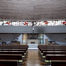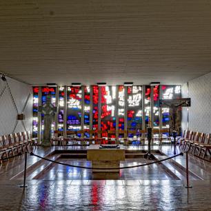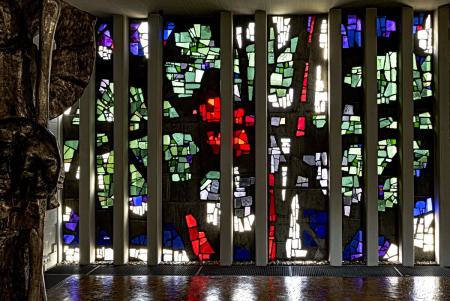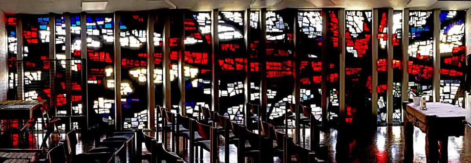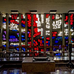 an der Nordwestwand, ursprünglich als Sakramentskapelle gedacht, wird erleuchtet durch das Glasbetonfenster. Es zeigt einen liegenden Lebensbaum in Rot auf Weiß und will den sich-hingebenden Christus am Kreuz versinnbilden: Die Liebe Gottes, die sich für uns hergibt.