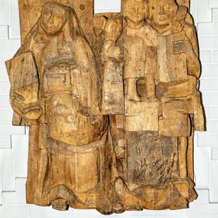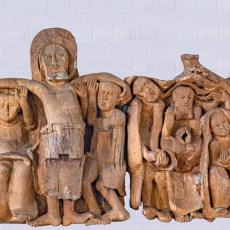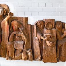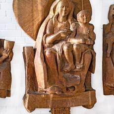 Der Marienfries ist eine Darstellung der Sieben Freuden Mariens und auch unserer Freuden. Die beeindruckende Großplastik hat sieben Einzeltafeln, aus 400 Jahre altem Eichenholz geschnitten. Die Figurengruppen rufen in unser Gedächtnis und unser Erinnern: