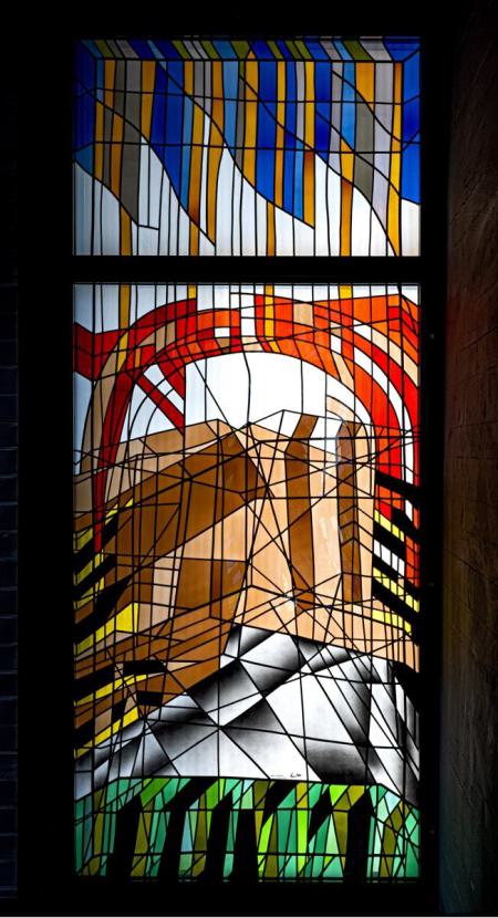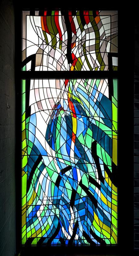 in Betonglas ist im Formspiel eines Kleeblattes aufgebaut – Symbol für die Grüne Insel Irland, von der Columban kam, und für das Kreuz der Hoffnung, das er vor 1.400 Jahren unseren Vorfahren hierher gebracht hat. In der Mitte des Fensters das Herz Christi in leuchtendem Rot, wohl auch das Herz Columbans, der sich für den Auftrag Christi hergegeben hat (540-615). Violette Flächen weisen auf die strenge Umkehrpredigt der Mönche hin. Aber ebenso scheint das Weiß der Begnadung und Berufung für die Bekehrten auf.