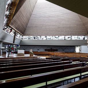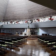 Der „Christusmaler" Roland Peter Litzenburger (1917-1986) hat das Glasband, das sich um den ganzen Innenraum zieht, in mystisch-blau-violetten Tönen gestaltet: Das Netz ist ausgeworfen (die Ruten der Bleiverglasung), Fische sind darinnen, die alle der Mitte Christus zuschwimmen, von seinen dunkelroten Wundmalen angezogen. Des Weiteren entwarf Litzenburger in kräftiger Glasbeton-Manier das Columbansfenster (in der Südostecke), das Tauffenster (an der Westwand) und das Fenster in der heutigen Marienkapelle.