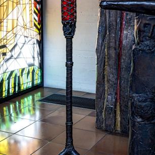 (rechts von der Bundeslade) ist ebenfalls mit irokeltischen Ornamenten geschmückt und trägt die Kerzen, die sieben Flammen des Herrn. Nach alter jüdischer Überlieferung heißen die Flammen: Gott, Hunger, Durst, Sprache, Leidenschaft, Musik / Tanz, Flamme der Liebe.