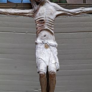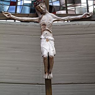 (der Christus-Corpus stammt aus dem rheinischen Raum, etwa um 1740) ist von Wendelin Matt gestaltet worden als Segen-Zeichen „Tau", des letzten Buchstabens im semitischen Alphabet: „Mein bist du, ich habe dich gezeugt" (vgl. Ez 9,4 / Apk 7,3), spricht Gott zu jedem neugeborenen Menschenkind. In die Kreuzbalken sind Durchbrüche gebrochen wie Tore zur Auferstehung, darinnen kleine Broncefiguren, die Totenerweckungen darstellend von Lazarus, von des Jairus' Töchterlein, vom Jüngling aus Nain. Im Kreuz sind auch wir zum Leben erweckt!