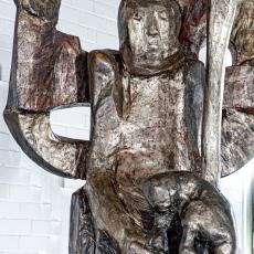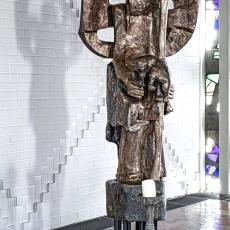 (3) Die Geburt aus Maria, der Jungfrau und Mutter, die zum Thron für Gottes Sohn geworden ist. Christus ist die Mitte der Skulptur. Marias Dienst gilt ihm. Der große Nimbus um Maria, fast wie der Goldgrund einer Ikone, lässt deutlich werden, welches Leben in Maria und in jedem Menschen wirksam werden kann, wenn wir uns unter die Weisung Gottes geben.