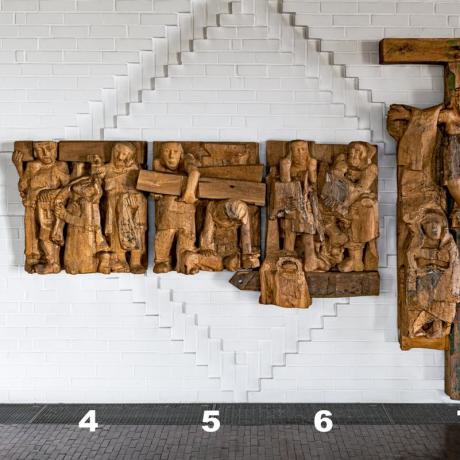 (Wir gehen den Weg weiter, jetzt von links außen nach rechts) – Die 4. Kreuzwegstation zeigt Frauen, die Jesus in ihrem Mitleiden begegnen, die Mutter Maria, Veronika, die Frauen aus Jerusalem. Und Jesus begegnet ihnen, er richtet sie auf und wird ihnen zur Tröstung. – In der 5. Station kommt Simon von Kyrene in die Szene; er wird gezwungen, das Kreuz Jesu mitzutragen, und wird doch selbst am meisten getragen. Wer Jesus begegnen will, der muss mit unters Kreuz, dort ist der Herr immer zu finden. – 6. Station: Wir stehen betroffen am Ort der Entblößung, der Entehrung, der Entäußerung. Jesus – und mit ihm unzählig viele Menschenschwestern und –Brüder – wird ausgezogen und missbraucht, wird entwürdigt und entmenscht. Wenn unsere Würde nicht bei Gott hinterlegt wäre, wir wären verloren, vergessen, vernichtet! –
