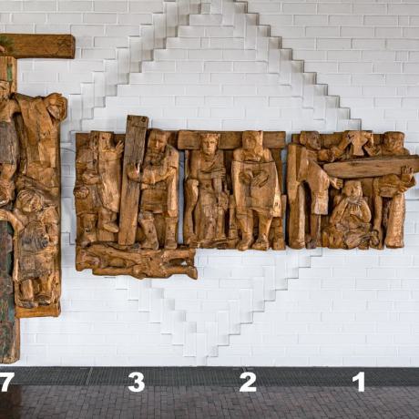 Der Weg, von rechts außen beginnend, geht dem Zerbruch und der Erhöhung des Herrn nach; zugleich ist er auch der Weg des Jesus-Jüngers zu jeder Zeit. Die drei ersten Stationen zeigen (1) Jesus, den in der Todesangst eingeengten und dennoch zum Leiden bereiten Gottesknecht, den Engel zu entlasten versuchen indem sie ihm den Becher der Stärkung reichen. – Dann (2) wäscht sich Pilatus in Unschuld, und Jesus übernimmt Schuld; Recht setzt sich nicht durch, Unrecht nimmt seinen Lauf; die Verurteilung eines Schuldlosen für der Menschen Schuld. – Die 3. Station ist der Ort des dreimaligen Falles; die Last der Welt ist schwer; der Balken der Unmenschlichkeit und Sünde drückt Jesus, den menschlichsten aller Menschen, in die Erde hinein.