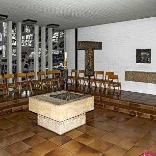 mit dem mystisch-blauen Licht des Tauffensters. In der Mitte des Raumes der Taufstein, der von Bildhauer Matt 1980 mit dem gestalteten Broncebecken vollendet worden ist. Reich an theologischen Aussagen stellt die Plastik aus einem Guss den Zug der Israeliten durchs Meer dar, angeführt von Mose mit dem wegweisenden Stab. Die vom Pharao angeführten Reiter verfolgen die aus der Knechtschaft Fliehenden.