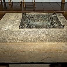 in die Wand eingefügt und mit den Symbolen des fließenden Wassers und der sieben Sakramente geschmückt, verwahrt das Taufgefäß, die Ölgefäße, das Taufkleid des Gotteskindes.