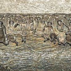 Das Volk Gottes wird durch das Wasser schreitend gerettet, während die Ägypter im Wasser umkommen. Das ist ein vielsprechendes Sinnbild der Taufe: Der Getaufte stirbt mit Christus der Sünde und erfährt durch ihn das Auferstehen-dürfen zum Leben Gottes; Taufe als Abstieg und als Aufstieg (angedeutet auch durch die Stufen, die zum Taufstein hinabführen und dann wieder hinaufführen). – In den Darstellungen des Taufbeckens ist die Quadratur des Kreises erkennbar (das Vollkommene und das Vollendende); das alles durchkreuzende, heiligende Kreuz; das Chaotische in den Wasserbewegungen wird zur gesegneten Ordnung; die Ströme des Lebens erquicken und machen lebendig den Getauften durch die sieben Sakramente.
