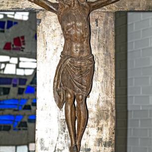 über dem Altar will wie eine Brücke sein zwischen Himmel und Erde, zwischen Gott und uns Menschen Das Kreuz ist die Nachempfindung eines gotischen Christus-Corpus. Die Kunsthandwerkerin, Fanny Maier, Friedrichshafen, hat ihn mühevoll und mit glaubendem Sinn modelliert. Leuchtendrote Glassteine zeigen die Wundmale und die Dornenkrone des leidenden und auferstandenen Herrn.
