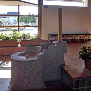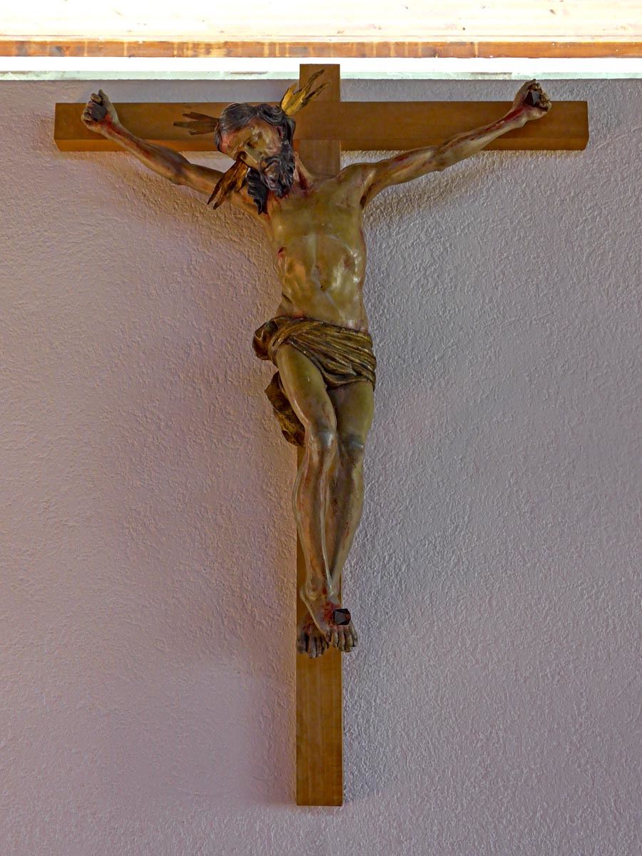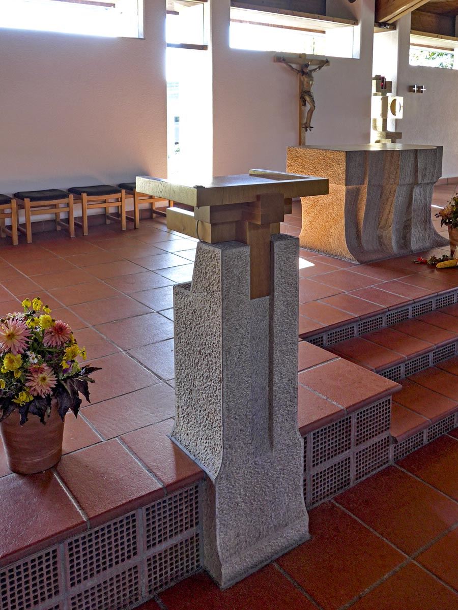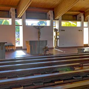 Der Altar, der Ambo, das Taufbecken, die Sakramentstele, das Weihwasserbecken und der Opferstock stammen von Herbert Albrecht aus dem Jahr 1978. Die beiden Figuren „Maria mit Kind“ und „Antonius“ stammen vom Anfang des 20. Jahrhunderts. In der Werktagskapelle steht eine gotische Marienfigur mit Kind, die Jakob Ruß zugeschrieben wird. Sie entstand um 1490 und stand früher in der 1974 erbauten Feldkapelle.