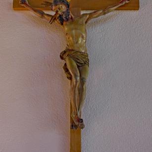 Das Langhaus ist ein polygonaler Raum mit zeltdachförmiger Holzdecke. Auf der Empore steht die Orgel.