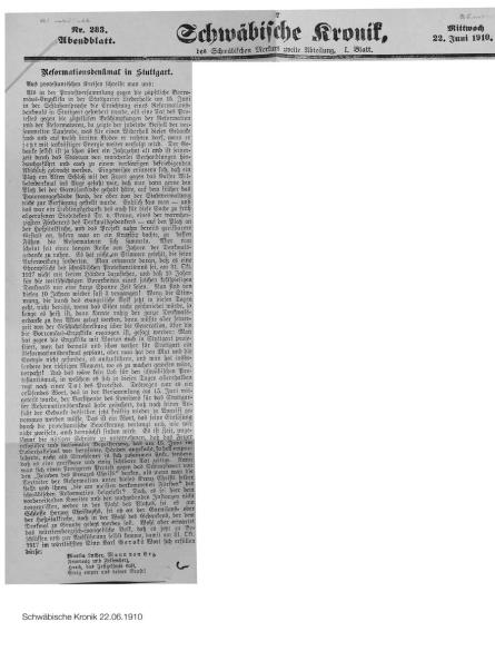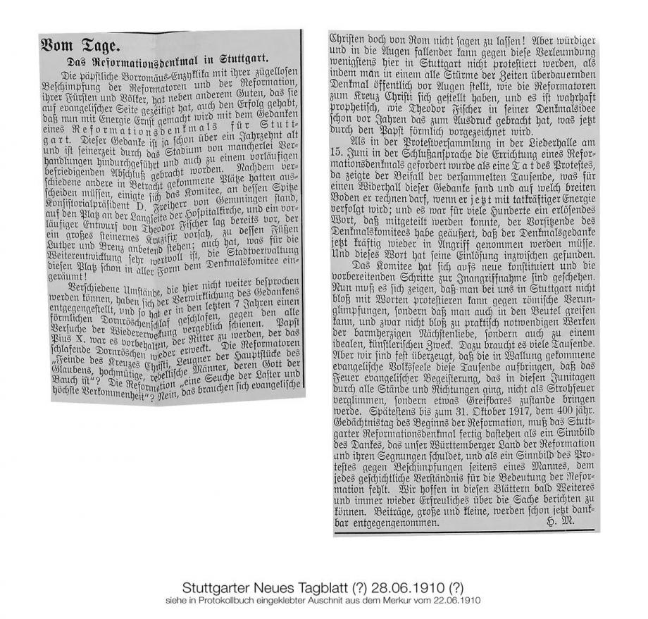 Als in der Protestversammlung gegen die päpstliche Borromaeus-Enzyklika in der Stuttgarter Liederhalle am 15. Juni in der Schlussansprache die Errichtung eines Reformationsdenkmal in Stuttgart gefordert wurde als eine Tat des Protestes gegen die zügellosen Beschimpfungen der Reformation und der Reformatoren, da zeigt der jubelnden Beifall der versammelten Tausende, was für einen Widerhall dieser Gedanke fahnd und auf welch breiten Boden er rechnen darf, wenn er jetzt mit tatkräftiger Energie weiter verfolgt wird. Der Gedanke selbst ist ja schon über ein Jahrzehnt alt und ist seinerzeit durch das Studium von mancherlei Verhandlungen hindurchgeführt und auch zu einem vorläufigen befriedigenden Abschluss gebracht worden. Eingeweihte erinnern sich, dass ein Platz am Alten Schloss mit der Front gegen das Kaiser Wilhelm Denkmal ins Auge gefasst war, dass man dann gerne den Platz bei der Garnisonkirche gehabt hätte, auf dem früher das Panoramagebäude stand, der aber von der Stadtverwaltung nicht zur Verfügung gestellt wurde. Endlich kam man – und das war ein Lieblingsgedanke des auch für diese Sache zu früh abgerufenen Stadtdekan Dr. von Braun, eines der warmherzigsten Förderers des Denkmalgedankens – auf den Platz an der Hospitalkirche, und das Projekt nahm bereits greifbare Gestalt an, sofern man an einem Kruzifix dachte, zu dessen Füßen die Reformatoren sich sammeln. Aber nun scheint seit einer langen Reihe von Jahren der Denkmalsgedanke zu ruhen. Es hat nicht an Stimmen gefehlt, die seine Auferweckung forderten. Man erinnerte daran, dass es eine Ehrenpflicht des schwäbischen Protestantismus sei, am 31. Oktober 1917 nicht mit leeren Händen dazustehen, und daß 10 Jahre für die weitsichtigen Vorarbeiten eines solchen kostspieligen Denkmals nur eine kurze Spanne Zeit seien. Nun sind von diesen 10 Jahren wieder fast 3 vergangen! Wenn die Stimmung, die durch das evangelische Volk jetzt in diesen Tagen geht, nicht benutzt, wenn das Eisen nicht geschmiedet würde, solange es heiß ist, dann könnte ruhig der ganze Denkmalsgedanke zu den Akten gelegt werden, dann müsste aber seinerzeit von der Geschichtschreibung über die Generation, über die die Borromaeus=Enzyklika ergangen ist, gesagt werden: Man hat gegen die Enzyklika mit Worten auch in Stuttgart protestiert, man hat damals und schon vorher für Stuttgart ein Reformationsdenkmal geplant, aber man hat den Mut und die Energie nicht gefunden, es auszuführen, und man hat insbesondere den richtigen Moment, wo es zu machen gewesen wäre, verpaßt! Und das wäre kein Lob für den schwäbischen Protestantismus, in welchem es sich in diesen Tagen allenthalben regt nach einer Tat des Protestes. Deswegen war es ein erlösendes Wort, dass in der Versammlung am 15. Juni mitgeteilt wurde, der Vorsitzende des Komitees für das Stuttgarter Reformationsdenkmal habe geäußert, das nach seiner Ansicht der Gedanke desselben jetzt kräftig wieder in Angriff genommen werden müsse. Das ist ein Wort, dass seine Einlösung durch die protestantische Bevölkerung verlangt und, wie wir nicht zweifeln, auch demnächst finden wird.